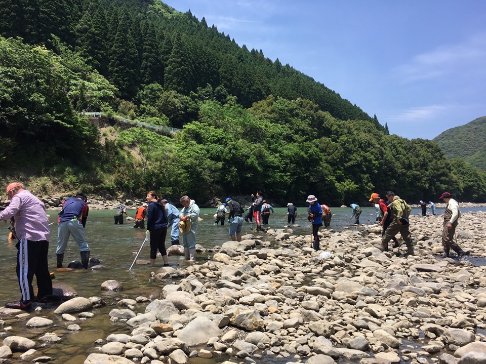 マイストーン作戦とは、アユが縄張りとする川底の石(餌場)を、釣り人や地域住民がデッキブラシなどで磨き、コケ(餌となる珪藻など)の発生を促して漁場環境を改善・保全する活動です。